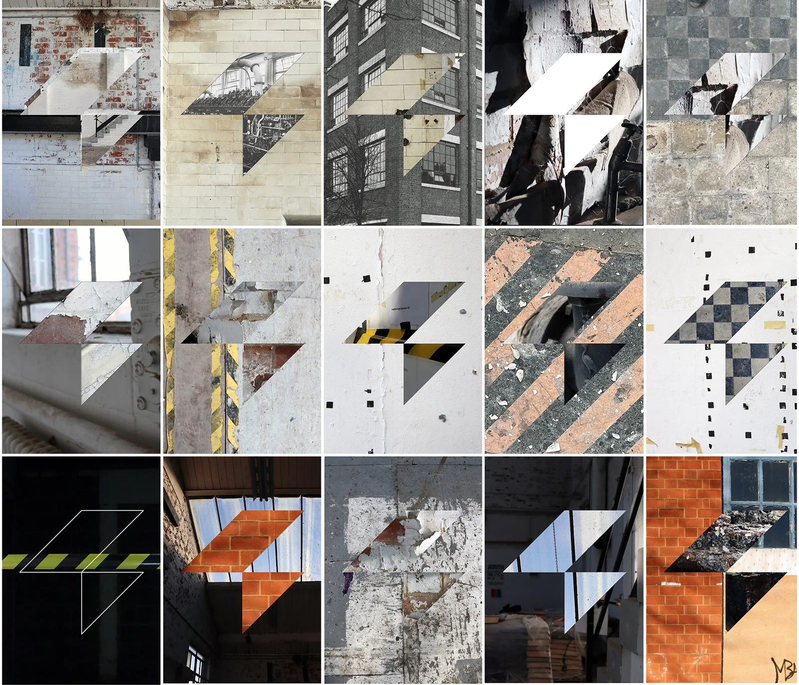 A collage of 15 photos of urban walls and floors with geometric cut-out designs revealing different textures and materials of the underlying surfaces.