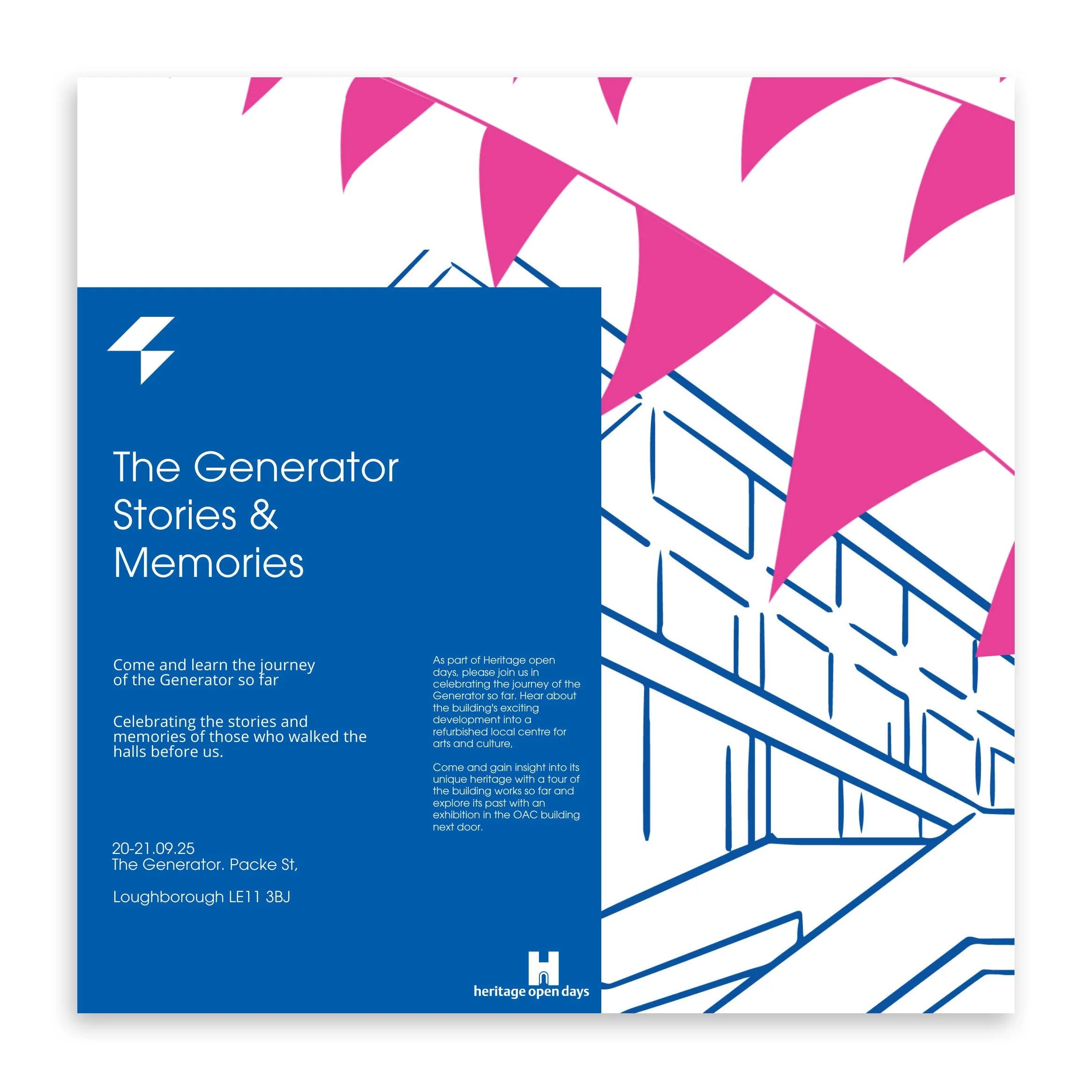 Join us for an exclusive behind-the-scenes look at The Generator's transformation during Loughborough Heritage Open Weekend 2025. This special event combines a hard-hat construction site tour with our "Stories and Memories" oral history exhibition.