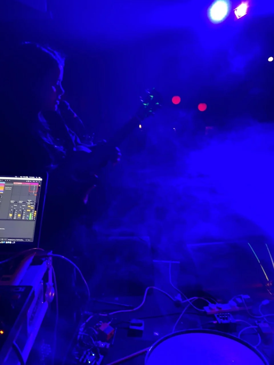 Dark scene with blue and purple fog, a person with long hair in silhouette, red and white lights, and DJ equipment visible on the right.