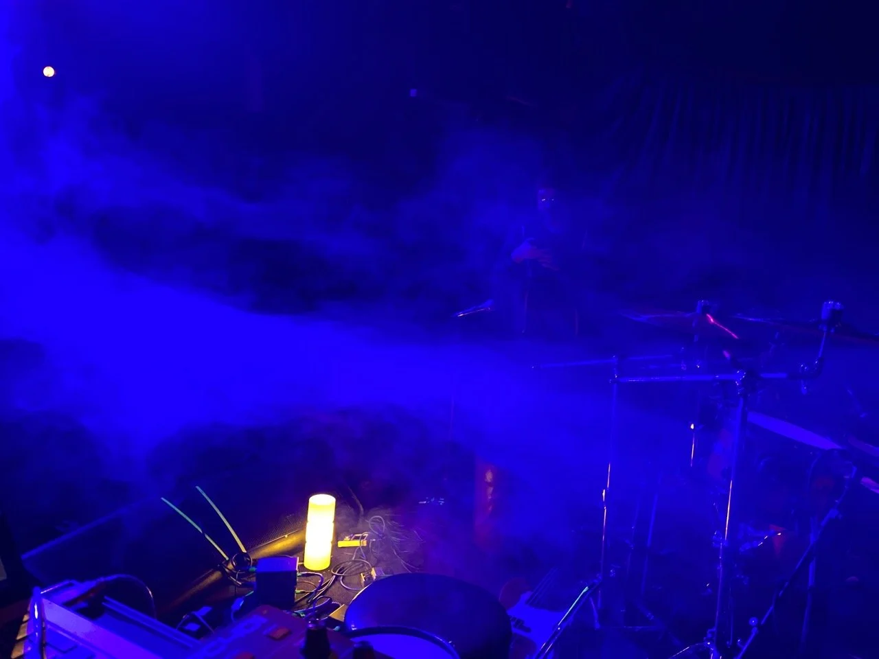 Stage with blue lighting, musical instruments including drums and microphones, and a small yellow lamp, suggesting a live performance or rehearsal.